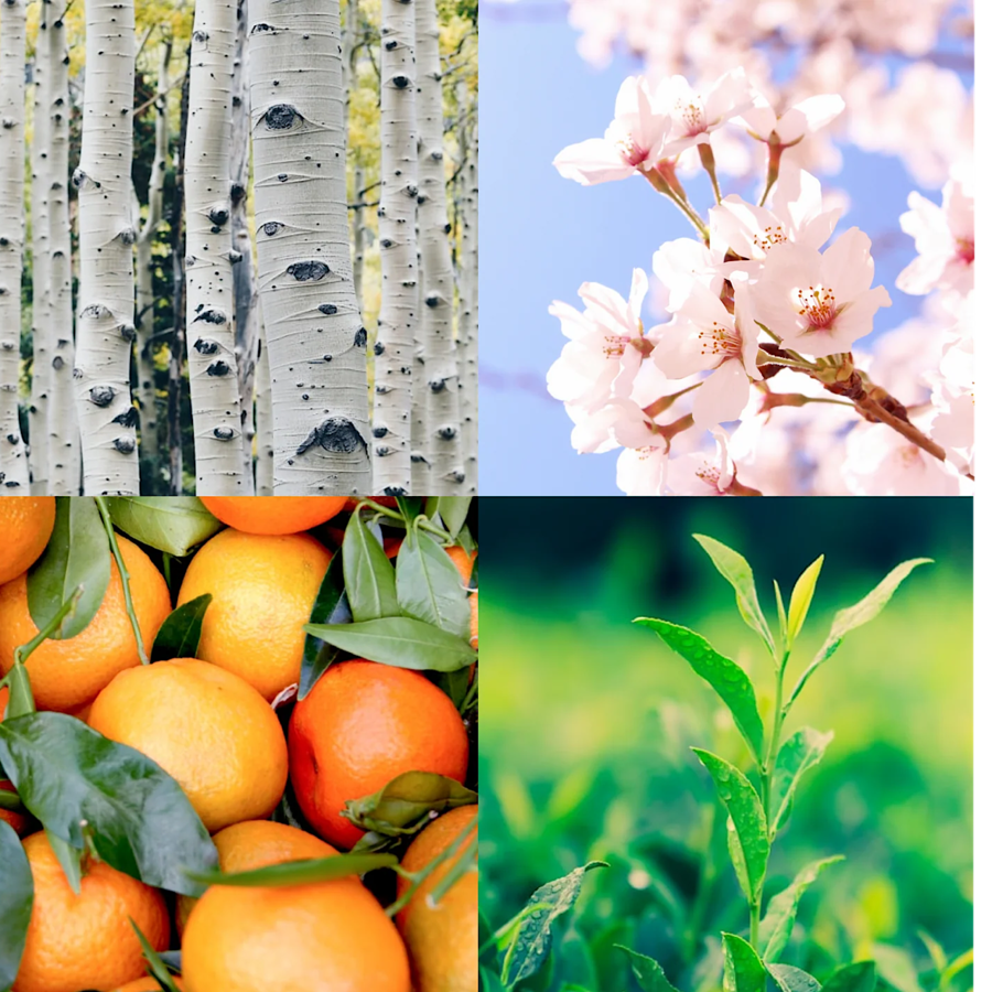 桜、楓、小麦、蜜柑、大豆、松、緑茶、白樺、杉、精製水