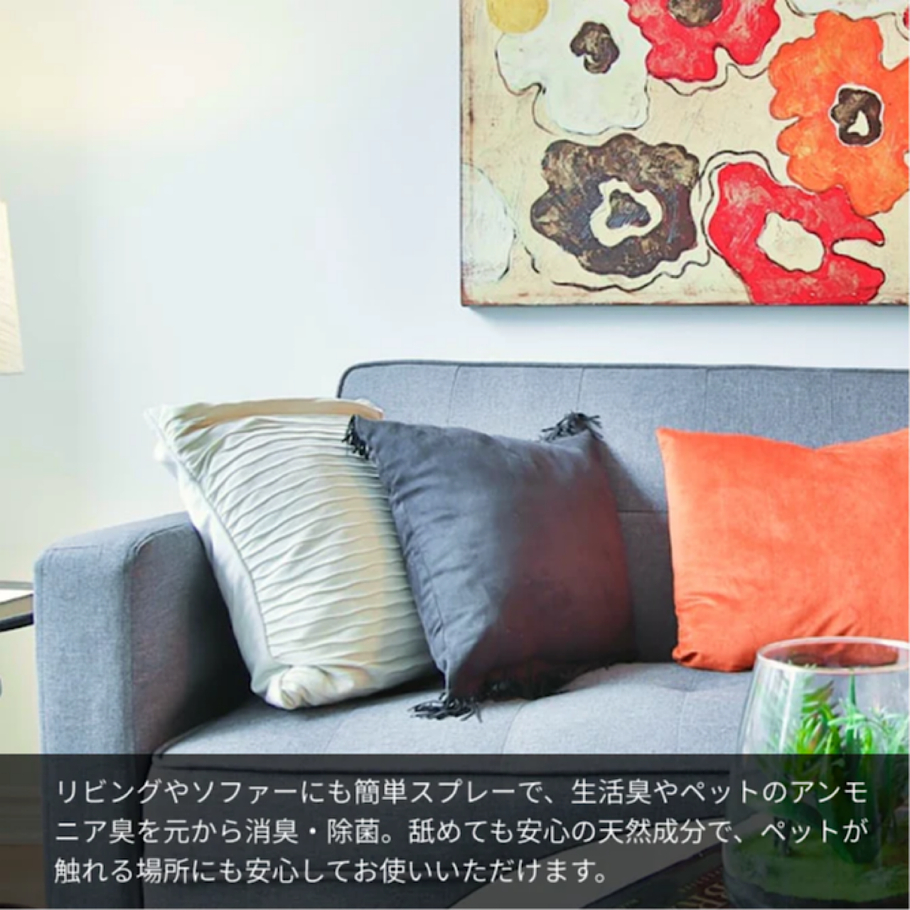臭いの元を分解し、抗菌効果が持続するため、臭い戻りせず、防カビ対策としても効果を発揮します。吹き付けた動物や、布地などの素材を痛めることなく、[pH値:4.92%]の弱酸性で安心してお使いいただける消臭剤です。